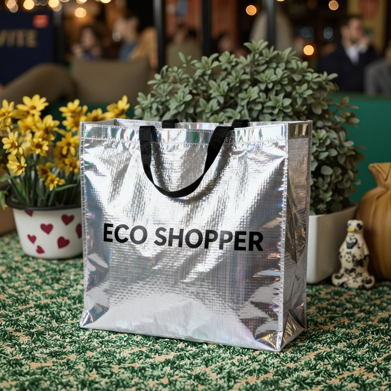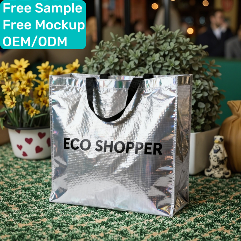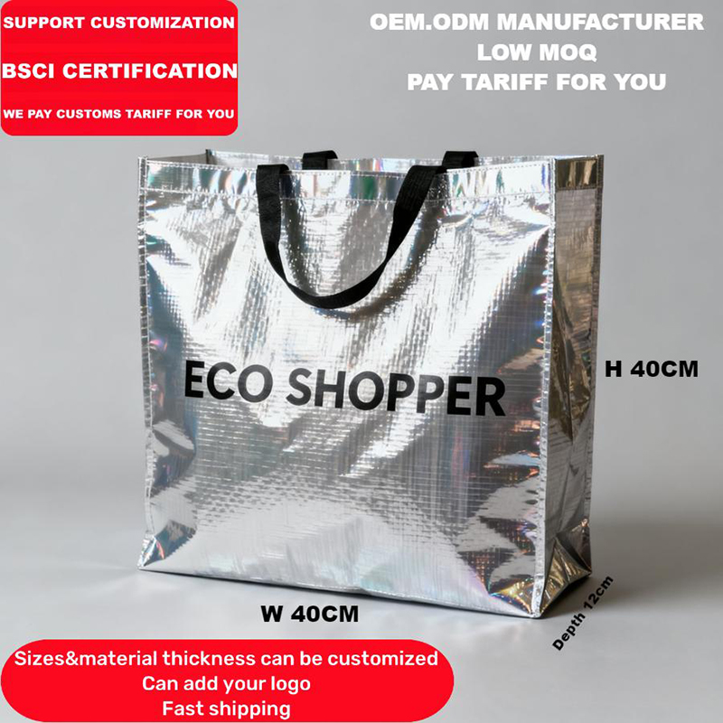 Item: OEM Custom-made Bags Eco Friendly Recycle Reflective Coating Silver PP Woven Tote Reusable Vegetable Shopping Bags
